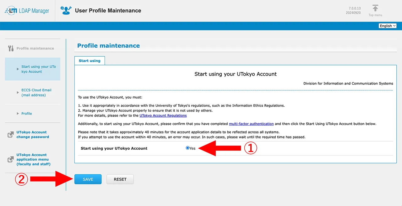 4. Read the UTokyo Account instructions carefully, and find “Start using your UTokyo Account” at the bottom of the page. Answer “Yes” and click “SAVE”.