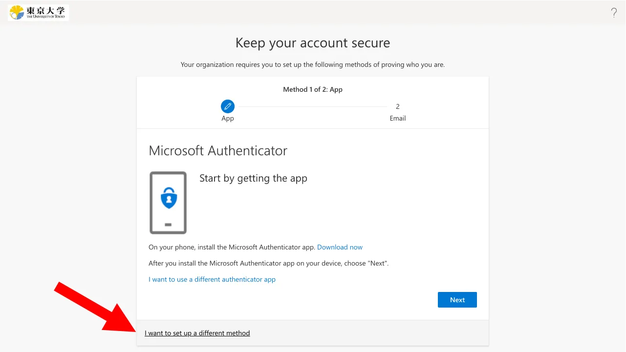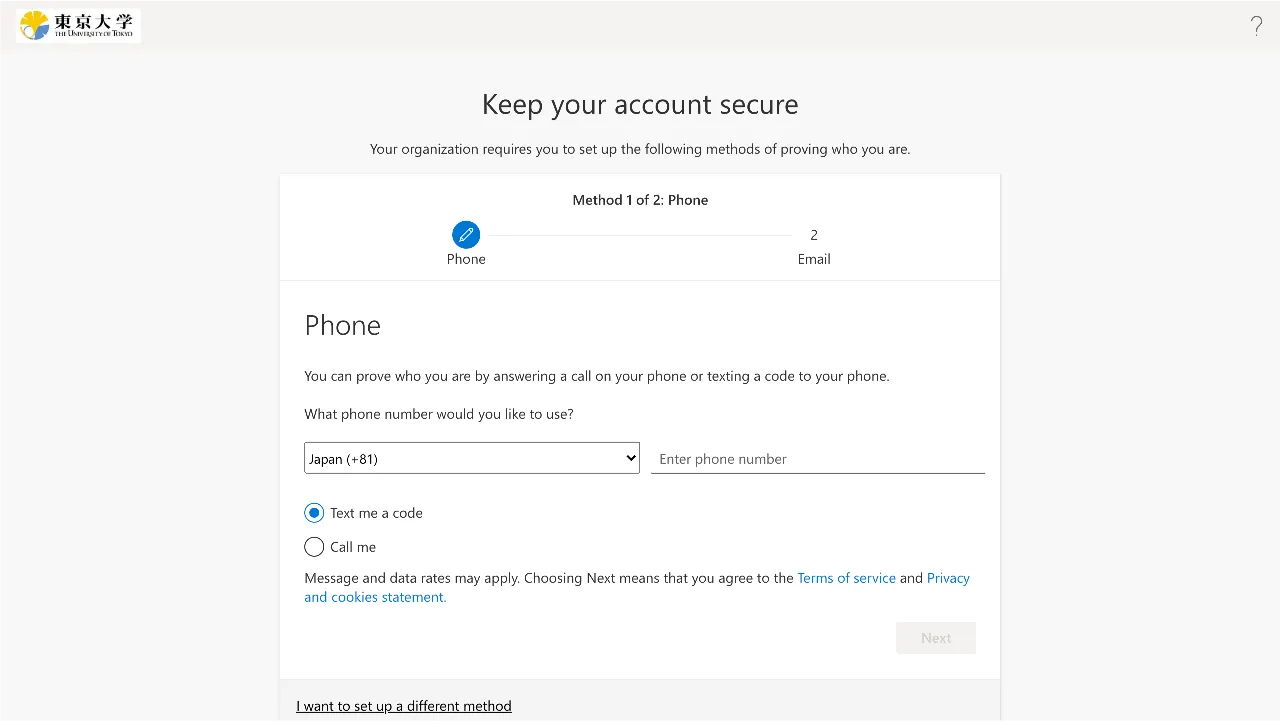 Be sure to add more than one verification method. MFA does work with just one verification method, but having only one verification method puts you at risk of getting completely locked out of your UTokyo Account when your verification method does not work (due to malfunction, model change, etc.). Adding multiple verification methods reduces this risk.