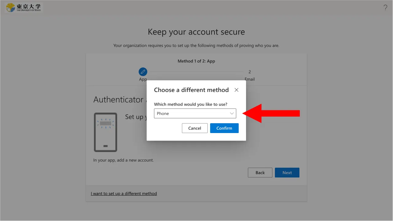 In the screen that appears after clicking “Add method”, “App password” and “Email” will also show up as choices for “Which method would you like to add?”. However, please be aware that these cannot be used for identity verification upon sign-in (they are for other purposes).