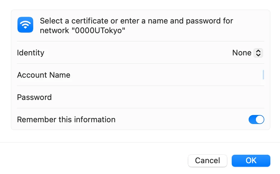 UTokyo Wi-Fi is a Wi-Fi service available to members of the University of Tokyo for educational and research purposes. Please refer to UTokyo Wi-Fi page first, which summarizes the general instructions for using the UTokyo Wi-Fi. If you still need the detailed instructions for terminal with macOS 13 Ventura, please refer to this page.