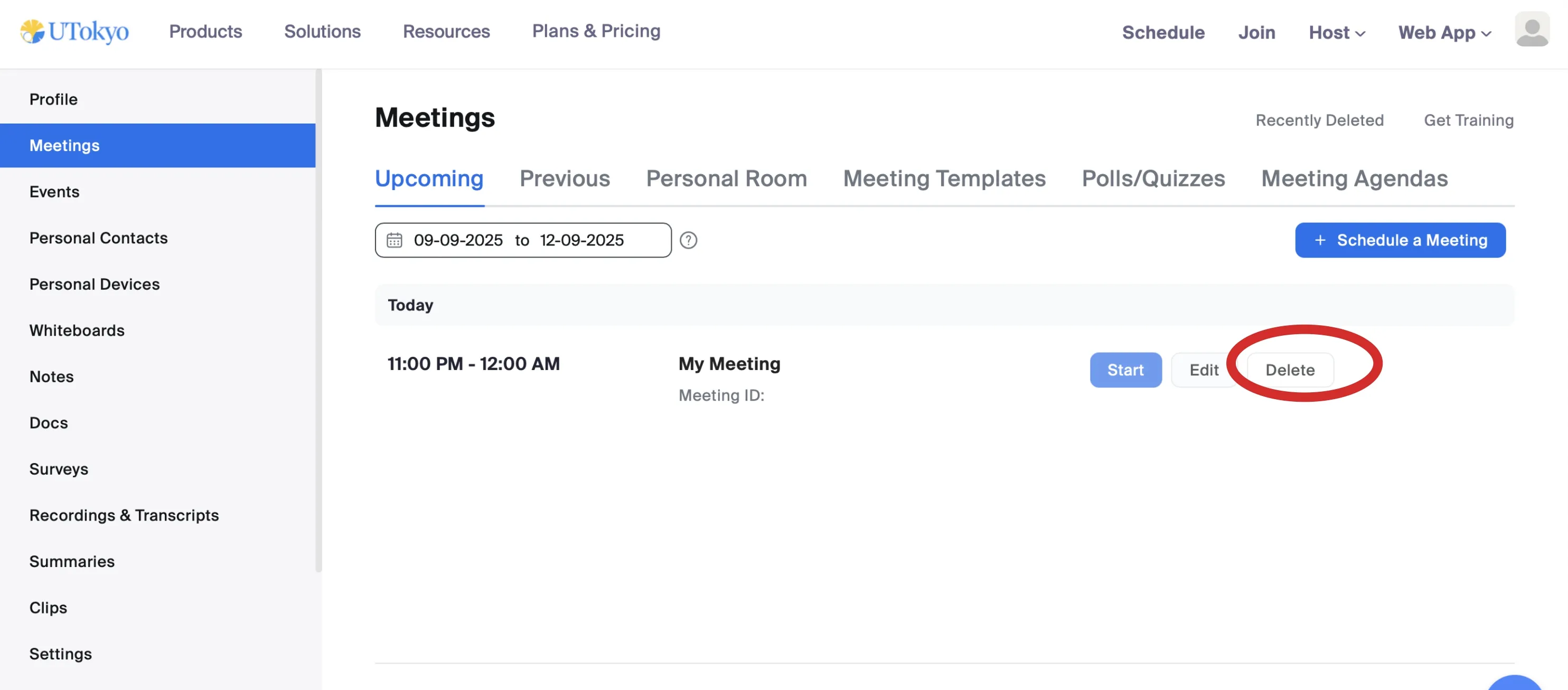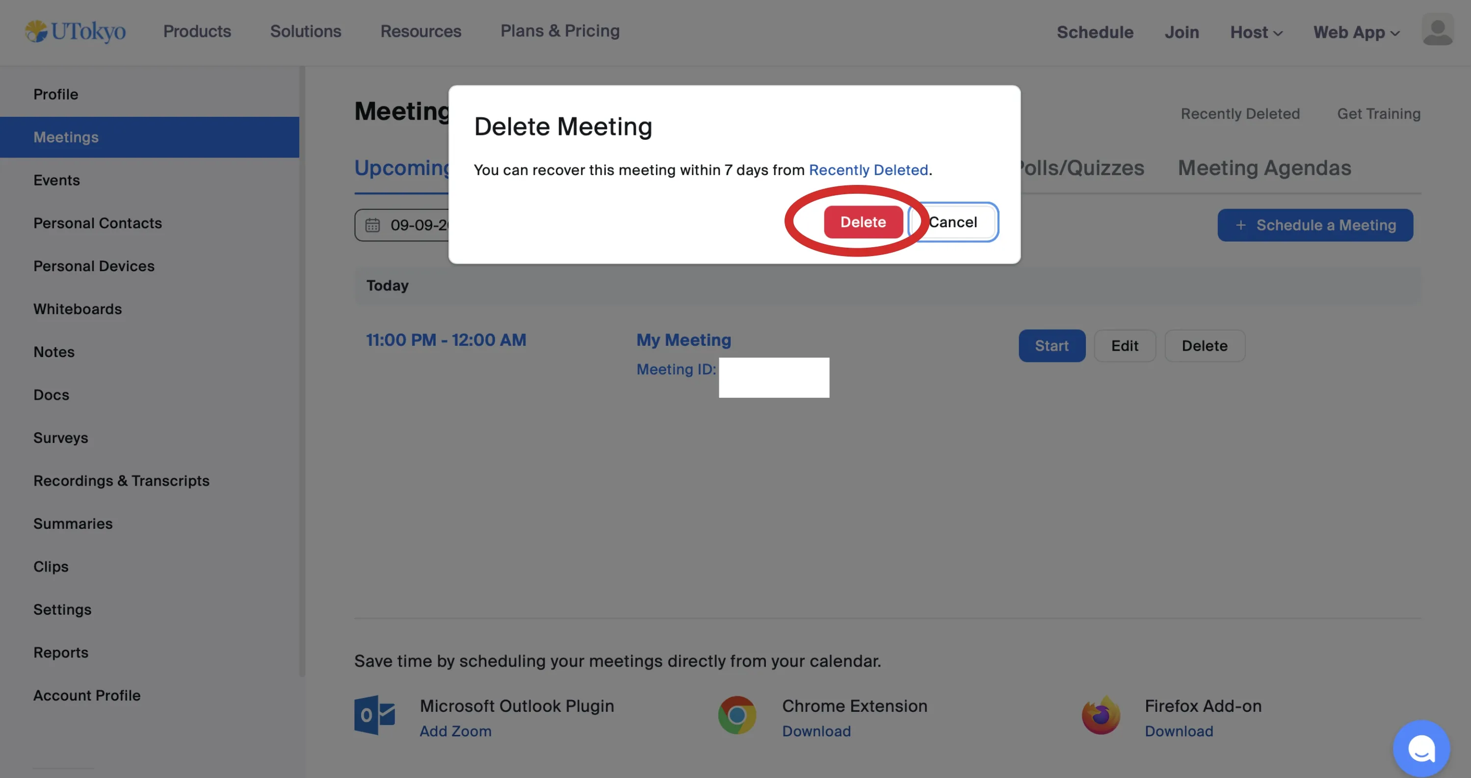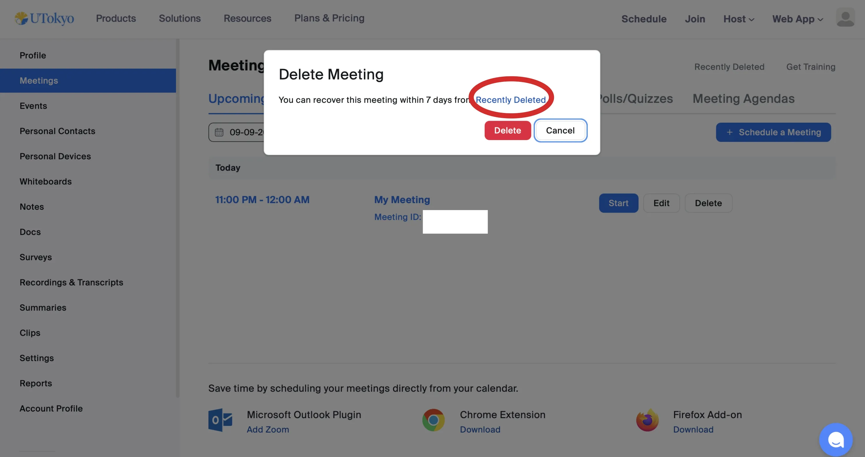 • Click Delete next to the meeting name to permanently delete the meeting without waiting for the 7-day retention period.