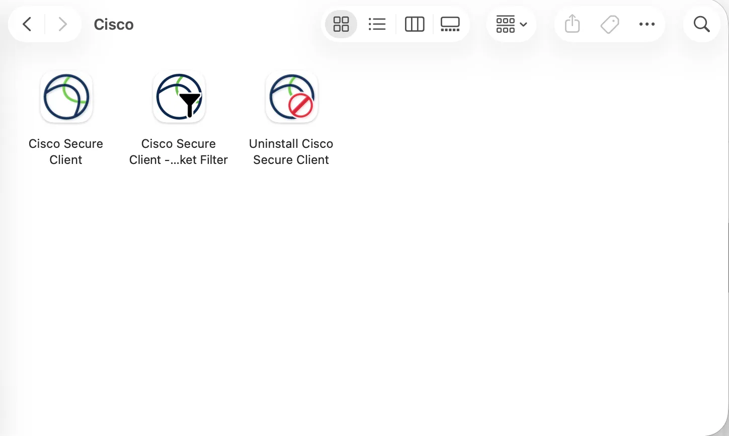 手順E: インストールが完了すると,アプリケーションフォルダに「Cisco」というフォルダが作成され,その中にVPNのクライアントアプリケーションであるCisco Secure Clientがインストールされています.