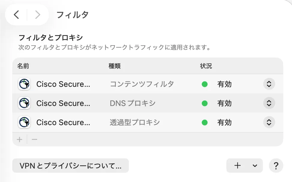 macOS 11 Big Sur以降のmacOSにCisco Secure Clientをインストールすると,「システム環境設定」→「ネットワーク」→「フィルタ」(または,「VPNとフィルタ」)に以下のような Cisco Secure Client - Socket Filter という3つの拡張機能が追加されます.これらの拡張機能はUTokyo VPN接続時に通信を振り分けるために必要な機能として常駐しており,通信内容の記録やホスト外への情報送付も行いません.またこれらはUTokyo VPNに接続しているか否かに関わらず常時接続状態になります.